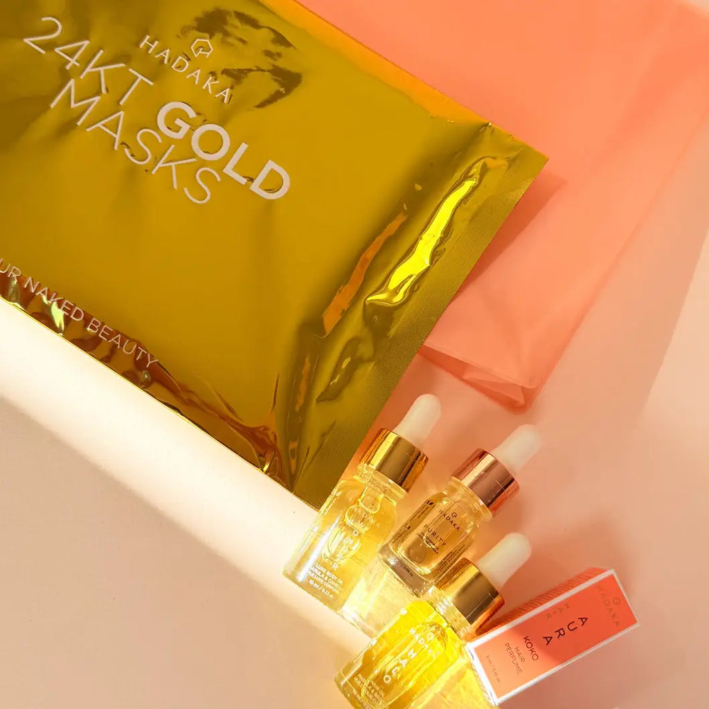 Your complete ritual for luminous skin, silky hair, and total radiance. The GOLD VAULT SET is a luxurious collection of HADAKA’s most-loved treatments, curated to restore glow from head to toe. Each formula works in harmony to hydrate, nourish, and rejuvenate, leaving your complexion radiant and your hair beautifully soft. Thoughtfully designed for self-care in all seasons, this premium set makes an elegant gift or the perfect way to indulge yourself. What's inside: * 24K GOLD Collagen Mask Trio (Face, Eye & Lips) Infused with real 24-karat gold to help diminish fine lines, dryness, and dullness. Leaving your skin feeling smooth, supple, and radiant. The ultimate glow treatment for dry winter air. * HALO Hair Oil (10 ml) Deeply nourishes strands, tames frizz, and adds mirror-like shine. A lightweight, non-greasy formula ideal for Canadian winters and humid summers alike. * WONDER Body Oil (10 ml) Replenishes moisture and enhances elasticity with a silky, fast-absorbing texture. Leaves skin soft and luminous without residue. * PURITY Oil of Marula (5 ml) A rich, antioxidant-packed facial oil that helps rejuvenate and protect tired skin. Perfect for boosting hydration in colder climates. * AURA Hair Perfume (3 ml) A delicate mist that refreshes and perfumes hair with HADAKA’s signature scent. Notes of vanilla, coco, and soft spice that last all day. * Cosmetic Bag A reusable, waterproof pouch ideal for travel or gifting. Thoughtfully designed to hold all your glow essentials in one place.